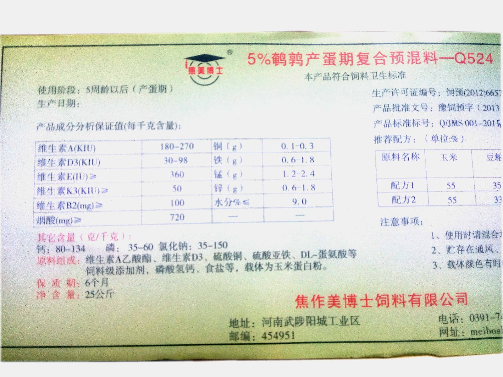 5、Q524鵪鶉專用預混料中添加貝殼粉、石粉、蛋殼粉等*佳的鈣源飼料,大大提高鈣利用率高。提高了蛋殼的品質,且耐運輸。